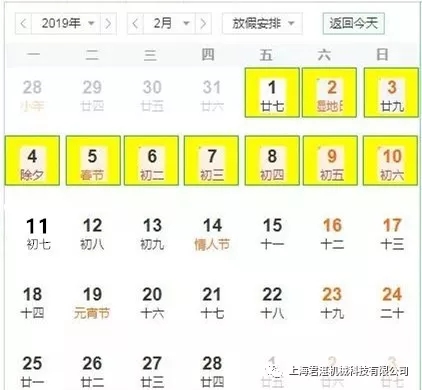 2019年“春节”放假时间为:2019年2月1日——2月10日,共10天。2019年2月11日(正月初七)正式上班。